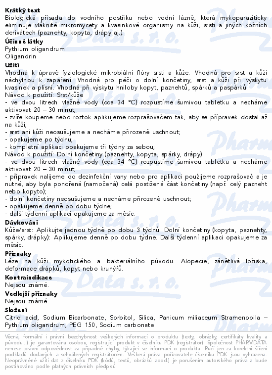Biologická přísada do vodního postřiku nebo vodní lázně, která mykoparaziticky eliminuje vláknité mikromycety a kvasinkové organismy na kůži, srsti a jiných kožních derivátech (paznehty, kopyta, drápy aj.).