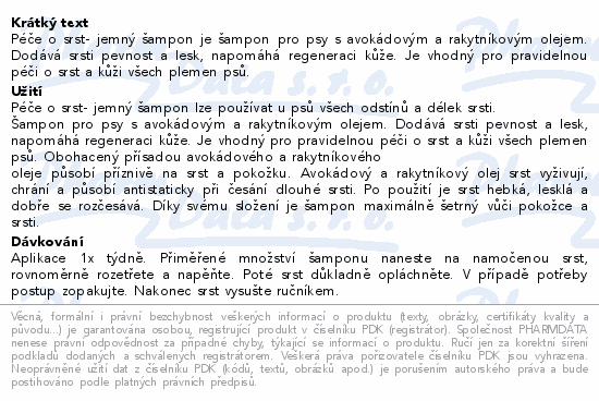 Péče o srst- jemný šampon je šampon pro psy s avokádovým a rakytníkovým olejem. Dodává srsti pevnost a lesk, napomáhá regeneraci kůže. Je vhodný pro pravidelnou péči o srst a kůži všech plemen psů.
