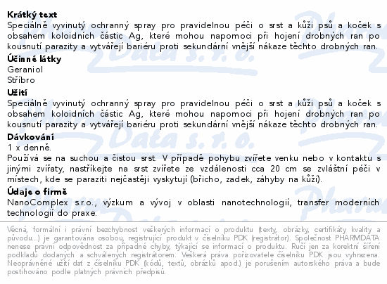 Speciálně vyvinutý ochranný spray pro pravidelnou péči o srst a kůži psů a koček s obsahem koloidních částic Ag, které mohou napomoci při hojení drobných ran po kousnutí parazity a vytvářejí bariéru proti sekundární vnější nákaze těchto drobných ran.