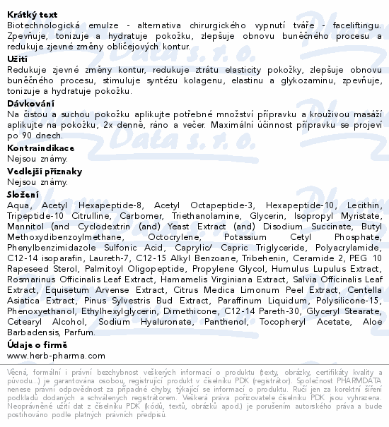 Biotechnologická emulze - alternativa chirurgického vypnutí tváře - faceliftingu. Zpevňuje, tonizuje a hydratuje pokožku, zlepšuje obnovu buněčného procesu a redukuje zjevné změny obličejových kontur.
