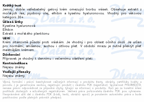 Jemný, dobře vstřebatelný gelový krém omezující tvorbu vrásek. Obsahuje extrakt z mořských řas, jojobový olej, elhibin a kyselinu hyaluronovou. Vhodný pro věkovou kategorii 30+.
