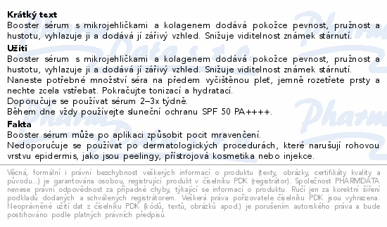 Booster sérum s mikrojehličkami a kolagenem dodává pokožce pevnost, pružnost a hustotu, vyhlazuje ji a dodává jí zářivý vzhled. Snižuje viditelnost známek stárnutí.