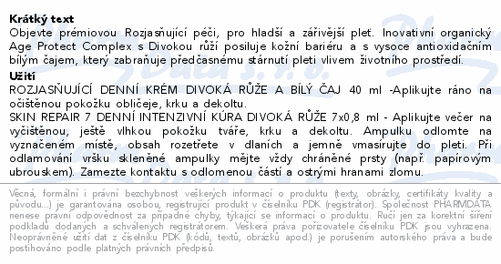 Objevte prémiovou Rozjasňující péči, pro hladší a zářivější pleť. Inovativní organický Age Protect Complex s Divokou růží posiluje kožní bariéru a s vysoce antioxidačním bílým čajem, který zabraňuje předčasnému stárnutí pleti vlivem životního prostředí.
