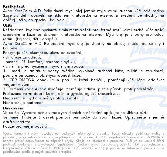 Avne XeraCalm A.D Relipidační mycí olej jemně myje velmi suchou kůži celé rodiny (kojenci, děti, dospělí) se sklonem k atopickému ekzému a svědění. Je vhodný na obličej i tělo, do sprchy i koupele.
