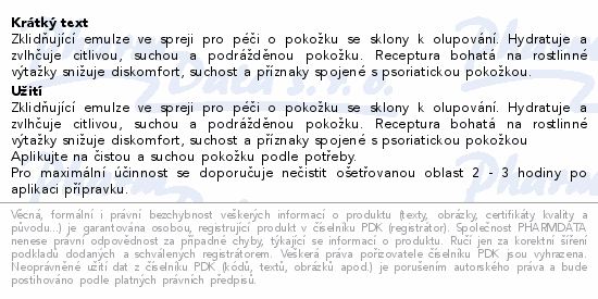 Zklidňující emulze ve spreji pro péči o pokožku se sklony k olupování. Hydratuje a zvlhčuje citlivou, suchou a podrážděnou pokožku. Receptura bohatá na rostlinné výtažky snižuje diskomfort, suchost a příznaky spojené s psoriatickou pokožkou.