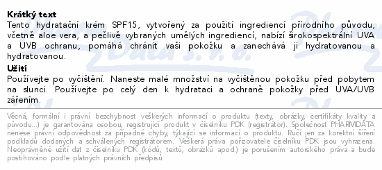 Tento hydratační krém SPF15, vytvořený za použití ingrediencí přírodního původu, včetně aloe vera, a pečlivě vybraných umělých ingrediencí, nabízí širokospektrální UVA a UVB ochranu, pomáhá chránit vaši pokožku a zanechává ji hydratovanou a hydratovanou.