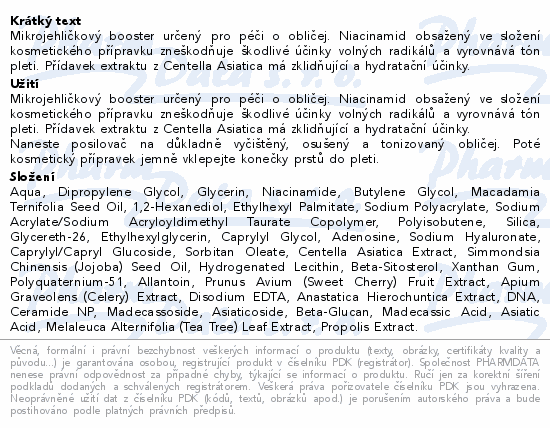 Mikrojehličkový booster určený pro péči o obličej. Niacinamid obsažený ve složení kosmetického přípravku zneškodňuje škodlivé účinky volných radikálů a vyrovnává tón pleti. Přídavek extraktu z Centella Asiatica má zklidňující a hydratační účinky.