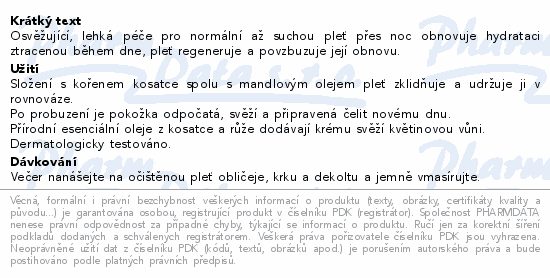 Osvěžující, lehká péče pro normální až suchou pleť přes noc obnovuje hydrataci ztracenou během dne, pleť regeneruje a povzbuzuje její obnovu.