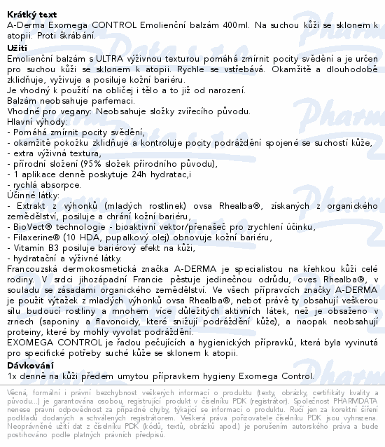 A-Derma Exomega CONTROL Emolienční balzám 400ml. Na suchou kůži se sklonem k atopii. Proti škrábání.