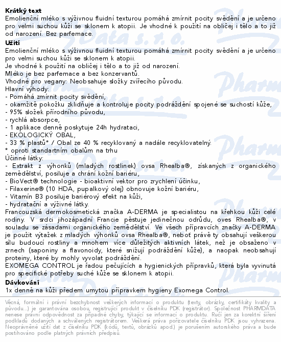 A-DERMA Exomega CONTROL Emolienční mléko 200ml