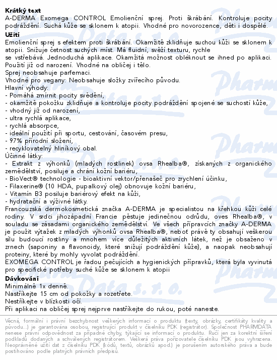 A-DERMA Exomega CONTROL Emolienční sprej. Proti škrábání. Kontroluje pocity podráždění. Suchá kůže se sklonem k atopii. Vhodné pro novorozence, děti i dospělé.