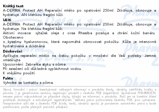 A-DERMA Protect AH Reparační mléko po opalování 250ml. Zklidňuje, obnovuje a hydratuje. AN křehkou fragilní kůži.