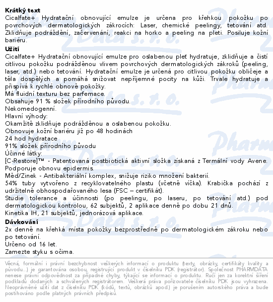 Cicalfate+ Hydratační obnovující emulze je určena pro křehkou pokožku po povrchových dermatologických zákrocích: Laser, chemické peelingy, tetování atd. Zklidňuje podráždění, začervenání, reakci na horko a peeling na pleti. Posiluje kožní bariéru.