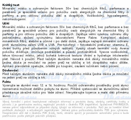 Avène Sun Minerální mléko SPF 50+ je opalovací přípravek s minerálními filtry, určený pro velmi citlivou, intolerantní nebo alergickou pokožku, včetně dětí od 2 let nebo osob po dermatologických zákrocích. Minerální filtry (oxid titaničitý a oxid zinečnatý) vytvářejí na pokožce ochranný film, který odráží sluneční paprsky a minimalizuje riziko podráždění. Přípravek dále obsahuje termální vodu Avène se zklidňujícími a zjemňujícími účinky. Obsahuje také silný antioxidant pre-tocopheryl (provitamin E), který chrání buňky pleti před poškozením volnými radikály, které vznikají působením UV záření. Textura mléka je výživná, bez parfemace a voděodolná. Může mírně zanechávat bílý film, což je u minerálních filtrů přirozené. Avène Sun Minerální mléko SPF 50+ je ideální volbou pro osoby hledající čistě fyzikální ochranu před sluncem, zejména při nesnášenlivosti na běžné opalovací krémy. Doporučuje se nanášet v dostatečném množství před pobytem na slunci a pravidelně přemazávat, zejména po koupání, pocení nebo otření ručníkem.