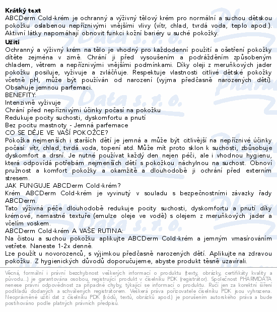 ABCDerm Cold Cream je ochranný a výživný tělový krém pro normální a suchou dětskou pokožku oslabenou nepříznivými vnějšími vlivy (vítr, chlad, tvrdá voda, teplo apod.). Aktivní látky napomáhají obnovit funkci kožní bariéry u suché pokožky.