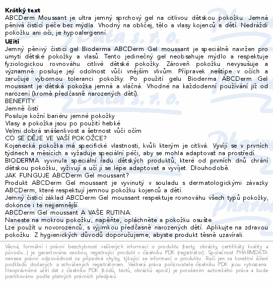 ABCDerm Moussant 1l - ultra jemný sprchový gel na citlivou pokožku. Jemný pěnivý čistící přípravek bez mýdla. Vhodný na obličej, tělo a vlasy kojenců a dětí. Nedráždí pokožku ani oči, je hypoalergenní.