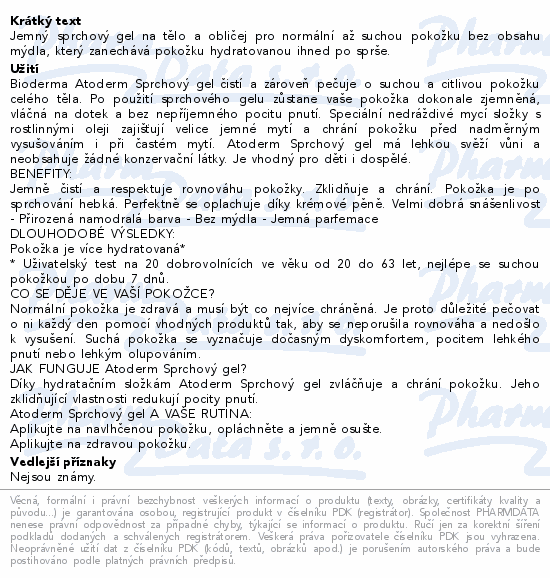 BIODERMA Atoderm Gel douche 1l je tekutý čisticí gel určený na suchou a citlivou pokožku celého těla, vhodný pro děti i dospělé. Bohatý mycí základ bez obsahu mýdla. Ultra jemné složení respektuje rovnováhu pokožky.