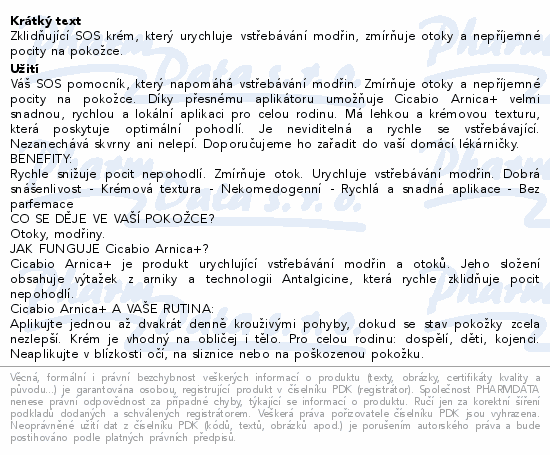 Cicabio Arnica+ je zklidňující SOS krém, který snižuje nepříjemné pocity na pokožce. Díky přesnému aplikátoru umožňuje Cicabio Arnica+ velmi snadnou, rychlou a lokální aplikaci pro celou rodinu. Jeho lehká, krémová textura poskytuje optimální pohodlí.