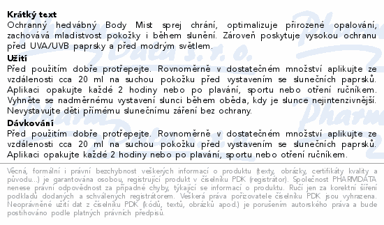 Ochranný hedvábný Body Mist sprej chrání, optimalizuje přirozené opalování, zachovává mladistvost pokožky i během slunění. Zároveň poskytuje vysokou ochranu před UVA/UVB paprsky a před modrým světlem.
