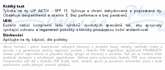 Tyčinka na rty LIP AKTIV - SPF 15. Vyživuje a chrání dehydrované a popraskané rty. Obsahuje dexpanthenol a vitamín E. Bez parfemace a bez parabenů.