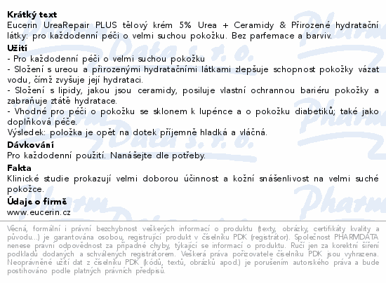 Eucerin UreaRepair PLUS tělový krém 5% Urea + Ceramidy & Přirozené hydratační látky: pro každodenní péči o velmi suchou pokožku. Bez parfemace a barviv.