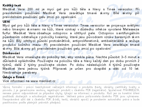 Mediket Versi 200 ml je mycí gel pro kůži těla a hlavy s Tinea versicolor. Při pravidelném používání Mediket Versi zesvětluje tmavé skvrny. Bílé skvrny při pravidelném používání gelu zmizí po opalování.