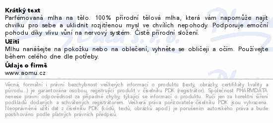 Parfémovaná mlha na tělo. 100% přírodní tělová mlha, která vám napomůže najít chvilku pro sebe a uklidnit rozjitřenou mysl ve chvílích nepohody. Podporuje emoční pohodu díky vlivu vůní na nervový systém. Čistě přírodní složení.