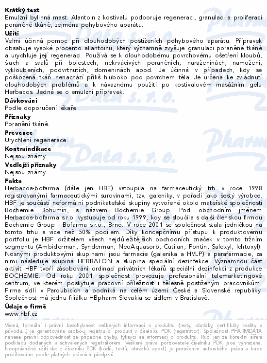 Emulzní bylinná mast. Alantoin z kostivalu podporuje regeneraci, granulaci a proliferaci poraněné tkáně, zejména pohybového aparátu.
