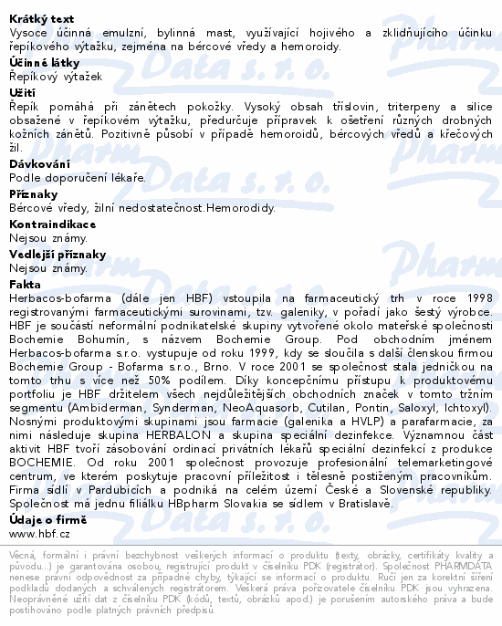 Vysoce účinná emulzní, bylinná mast, využívající hojivého a zklidňujícího účinku řepíkového výtažku, zejména na bércové vředy a hemoroidy.