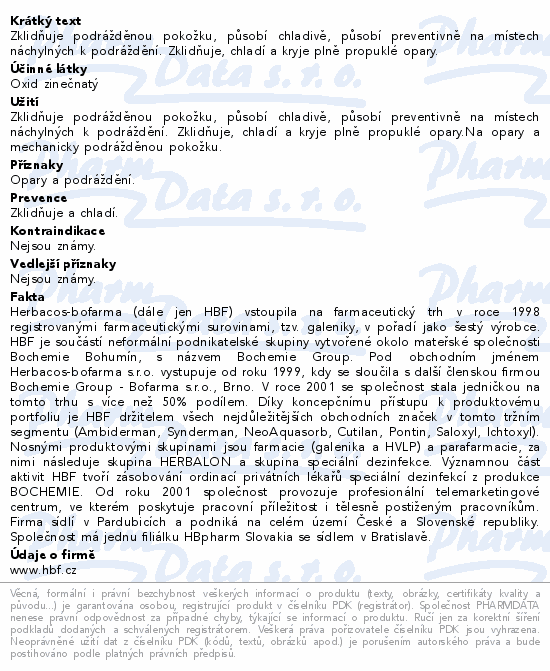 HBF Zinková mast je tradiční dermální přípravek určený k ochraně a zklidnění podrážděné pokožky. Obsahuje oxid zinečnatý (Zinci oxidum), který vytváří na pokožce ochrannou bariéru a pomáhá omezit vlhkost v postižené oblasti. Je vhodná pro dospělé, děti i kojence.