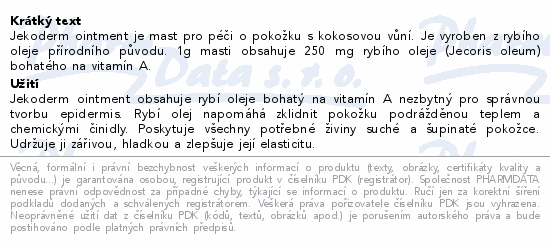 Jekoderm ointment je mast pro péči o pokožku s kokosovou vůní. Je vyroben z rybího oleje přírodního původu. 1g masti obsahuje 250 mg rybího oleje (Jecoris oleum) bohatého na vitamín A.