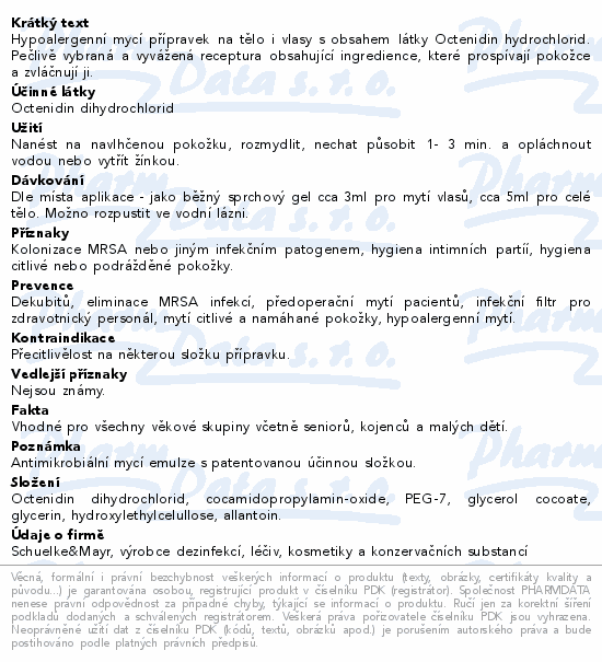 Hypoalergenní mycí přípravek na tělo i vlasy s obsahem látky Octenidin hydrochlorid. Pečlivě vybraná a vyvážená receptura obsahující ingredience, které prospívají pokožce a zvláčnují ji.