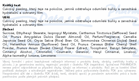 Cukrový peeling, který taje na pokožce, jemně odstraňuje odumřelé buňky a zanechává hydratační a ochranný film.