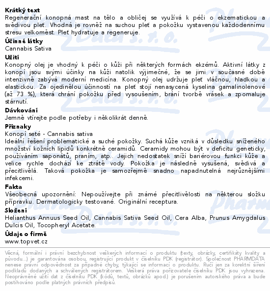 Regenerační konopná mast na tělo a obličej se využívá k péči o ekzematickou a svědivou pleť. Vhodná je rovněž na suchou pleť a pokožku vystavenou každodennímu stresu velkoměst. Pleť hydratuje a regeneruje.