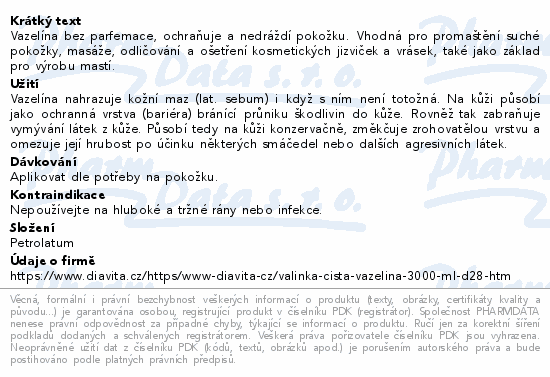 Vazelína bez parfemace, ochraňuje a nedráždí pokožku. Vhodná pro promaštění suché pokožky, masáže, odličování a ošetření kosmetických jizviček a vrásek, také jako základ pro výrobu mastí.