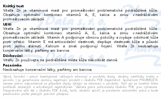 Vitella Zn je vitamínová mast pro promašťování problematické podrážděné kůže. Obsahuje optimální kombinaci vitamínů A, E, kalcia a zinku v nedráždivém promašťovacím základě.