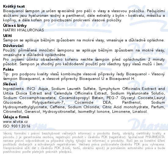 Bioaquanol šampon je určen speciálně pro péči o vlasy a vlasovou pokožku. Pečujícími složkami jsou hyaluronan sodný a panthenol, dále extrakty z bylin - kostivalu, měsíčku a kopřivy, a dále kofein pro povzbuzení prokrvení vlasové pokožky.