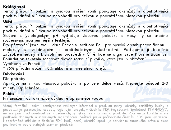 Tento přírodní* balzám s vysokou snášenlivostí poskytuje okamžitý a dlouhotrvající pocit zklidnění a úlevu od nepohodlí pro citlivou a podrážděnou vlasovou pokožku.