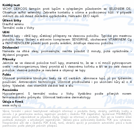 VICHY DERCOS šampón proti lupům s vylepšeným působením se SELENIEM DS. Obsahuje sulfid seleničitý. Zabraňte kontaktu s očima a poškozenou kůží. V případě vniknutí do očí ihned důkladně vypláchněte. Náhradní EKO náplň.