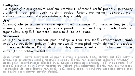 Bio arganový olej s vysokým podílem vitamínu E přirozeně chrání pokožku, je vhodný pro denní i noční péči, ideální na zimní období. Určeno pro normální až suchou pleť, včetně citlivé, ideální také pro oslabené vlasy a nehty.