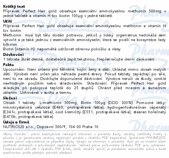 Přípravek Perfect Hair gold obsahuje esenciální aminokyselinu methionin 500mg v jedné tabletě a vitamín H tzv. biotin 100µg v jedné tabletě.