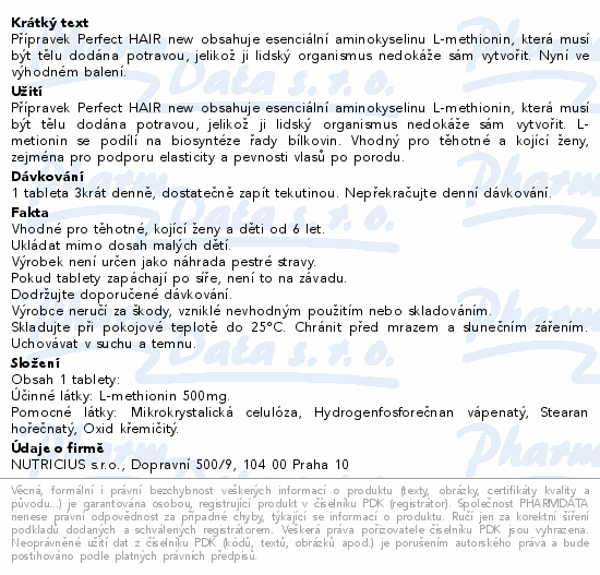 Přípravek Perfect HAIR new obsahuje esenciální aminokyselinu L-methionin, která musí být tělu dodána potravou, jelikož ji lidský organismus nedokáže sám vytvořit. Nyní ve výhodném balení.