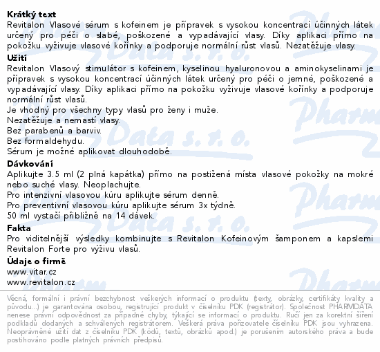 Revitalon Vlasové sérum s kofeinem je přípravek s vysokou koncentrací účinných látek určený pro péči o slabé, poškozené a vypadávající vlasy. Díky aplikaci přímo na pokožku vyživuje vlasové kořínky a podporuje normální růst vlasů. Nezatěžuje vlasy.