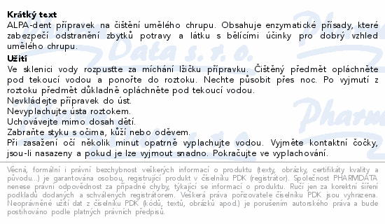ALPA-dent přípravek na čištění umělého chrupu. Obsahuje enzymatické přísady, které zabezpečí odstranění zbytků potravy a látku s bělícími účinky pro dobrý vzhled umělého chrupu.