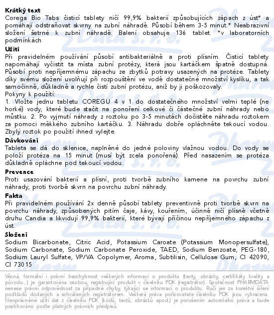 Corega Bio Tabs čisticí tablety ničí 99,9% bakterií způsobujících zápach z úst* a pomáhají odstraňovat skvrny na zubní náhradě. Působí během 3-5 minut.* Neabrazivní složení šetrné k zubní náhradě. Balení obsahuje 136 tablet. *v laboratorních podmínkách