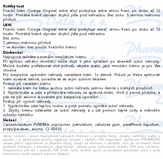 "Fixační krém Corega Original extra silný poskytuje extra* silnou fixaci po dobu až 12 hodin. Pomáhá bránit ulpívání zbytků jídla pod náhradou. Bez zinku. S jemnou mátovou příchutí. Balení 40 g. *ve srovnání bez použití fixačního krému"