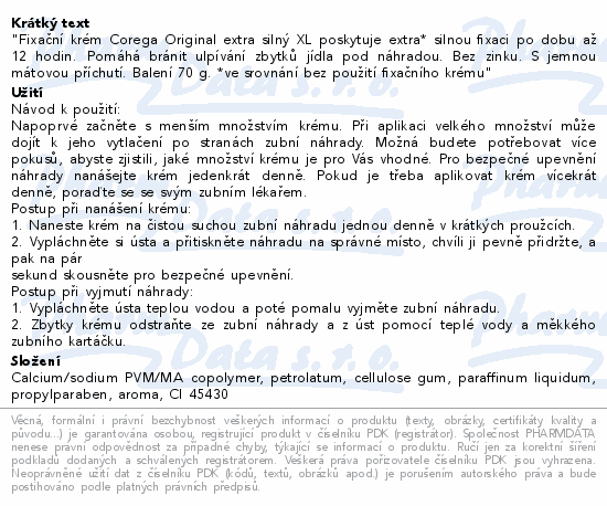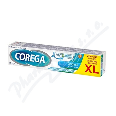 "Fixační krém Corega Original extra silný XL poskytuje extra* silnou fixaci po dobu až 12 hodin. Pomáhá bránit ulpívání zbytků jídla pod náhradou. Bez zinku. S jemnou mátovou příchutí. Balení 70 g. *ve srovnání bez použití fixačního krému"