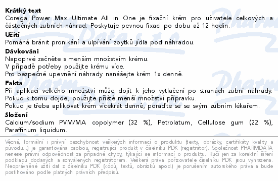 Corega Power Max Ultimate All in One je fixační krém pro uživatele celkových a částečných zubních náhrad. Poskytuje pevnou fixaci po dobu až 12 hodin.