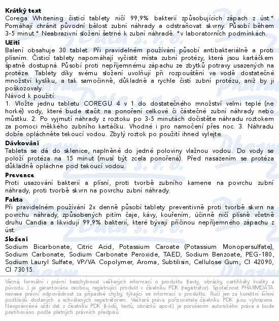 Corega Whitening čisticí tablety ničí 99,9% bakterií způsobujících zápach z úst.* Pomáhají chránit původní bělost zubní náhrady a odstraňovat skvrny. Působí během 3-5 minut.* Neabrazivní složení šetrné k zubní náhradě. *v laboratorních podmínkách.