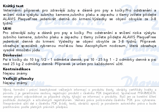 Veterinární přípravek pro psy a kočky proti zubnímu kameni, zubnímu plaku a zápachu z tlamy zvířete. Působí proti zánětu dásní. Přípravek obsahuje speciální mořskou řasu Algae D1070 s vysokým obsahem jódu.
